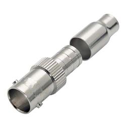This female BNC RF connector is designed for attachment to the widely used RG59 and RG62 coaxial cables utilizing readily-available crimp tools with standard crimp size: .324" for the crimp ferrule. The center contact is designed to be soldered to the cable center conductor. BNC connectors connect with a twist lock, making them popular for RF applications.
