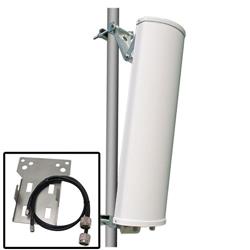 L-com's ARK2414DP-090-0 features HyperLink's HG2414DP-090 2.4 GHz dual polarized 14 dBi 90 degree sector antenna. Included with each antenna is a unique mounting bracket that allows the Ubiquiti? RocketM2 radio to be attached directly to the antenna. Also included are a pair of 195-series low-loss cable assemblies to connect the RocketM2 to the antenna. Customers can enjoy the cost saving of these kits compared to purchasing an Ubiquiti? antenna to use with the RocketM2 radio. The ARK2414DP-090-0 Kit includes: