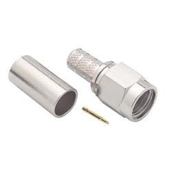This male SMA connector is designed for crimp attachment to RG58 coaxial cable utilizing readily-available crimp tools with standard crimp sizes: .213" for the crimp ferrule and .042" for the pin. This 50 Ohm subminiature connector utilizes a threaded coupling mechanism making it a popular choice in higher frequency applications.