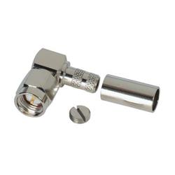 This right angle male SMA connector is designed for crimp attachment to RG58 coaxial cable utilizing a crimp size of .213 while the center pin contact is designed for solder attachment to the cable center conductor. This 50 Ohm subminiature connector utilizes a threaded coupling mechanism making it a popular choice in higher frequency applications.
