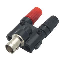 此款BNC母頭轉接線柱轉接器采用紅色和黑色接線柱以便進行識別。BNC插頭和接線柱的組合通常用于實驗室環境。