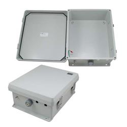 The NB121005-01 is a rugged weatherproof enclosure that is ideal for both indoor and outdoor applications. Constructed from molded halogen free self extinguishing fiberglass reinforced polyester (FRP), it is well suited for high temperature or corrosive environments. The integral mounting flange allows it to be wall mounted as well as on a flat surface without the need for extra mounting hardware. The fully gasketed lid features a stainless steel continuous hinge and stainless steel quick release latches with padlock hasps. The light grey color of the NB121005-01 is cleaner, cooler and aesthetically pleasing. Users can enjoy the physical benefits of better heat reflection and better UV resistance due to the lighter color. The contoured body provides an attractive and contemporary appearance. Holes provided in the enclosure can be used for two Type-N bulkhead lightning protectors or connectors. In addition, a grounding lug and a cable conduit connector are provided. The NB121005-02 features holes in the enclosure for two Type-N bulkhead lightning protectors or connectors. In addition, a grounding lug and a cable conduit connector are provided. The mounting plate is not included with this model. 特征