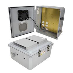The box is a rugged weatherproof enclosure that is ideal for both indoor and outdoor applications. Constructed from High-Impact, UV Resistant Polycarbonate material that provides superior durability to impacts and ease of modification while maintaining minimum weight. It is well suited for high temperature or corrosive environments. The lid includes two vents with installed rain guards and filters. The included wall mount brackets come uninstalled and bagged with their hardware inside of the enclosure. Once the brackets are installed the enclosure can be mounted directly to any flat wall surface provided proper screws are used into secure studs. The brackets, once installed, also allow you to use our HGX-PMT pole mount kits. The lid features a non-metallic hinge system that allows for quick removal & can be reattached just as quickly without the need for any tools. The enclosure comes with a pair of stainless-steel latches with padlock eyes allowing you to secure the enclosure from tampering. The enclosure comes in a Dark Gray (Pantone 422C) Mounting Plate The aluminum mounting plate included with the NBPC141206-10F-1 features standard surge protected duplex 120 VAC outlets and a terminal block for easy hook up to the externally provided line power. The enclosure also features holes for two N-Bulkhead Lightning Protectors or Connectors, a grounding lug and cable conduit connector. Cooling To help ensure trouble-free operation of electronic equipment, proper operating temperatures inside an enclosure needs to be maintained. With the built-in cooling fan, internal temperatures can be better maintained. This model is ideal in Hot environments. The NBPC141206-10F-1 model includes a thermostat-controlled 16.4W fan. The high airflow, low noise fan used allows warm air to be actively pushed out while the lower vent passively pulls in outside air into the enclosure. Filters for both ports prevent foreign objects or debris from entering the enclosure. The fan turns on when the internal temperature rises to 85° F (29° C) ±5° and turns off at 67° F (19° C) ±10°. The cooling fan does not require the use of any of the AC outlets, leaving them all available for your equipment. The HGX-PMT series of pole mounting kits allow the populated enclosure to be securely mounted to a variety of different size poles. Compatible versions include HGX-PMT13, HGX-PMT16, HGX-PMT28, HGX-PMT29, HGX-PMT30, & HGX-PMT33 附件