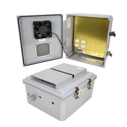 The box is a rugged weatherproof enclosure that is ideal for both indoor and outdoor applications. Constructed from High-Impact, UV Resistant Polycarbonate material that provides superior durability to impacts and ease of modification while maintaining minimum weight. It is well suited for high temperature or corrosive environments. The lid includes two vents with installed rain guards and filters. The included wall mount brackets come uninstalled and bagged with their hardware inside of the enclosure. Once the brackets are installed the enclosure can be mounted directly to any flat wall surface provided proper screws are used into secure studs. The brackets, once installed, also allow you to use our HGX-PMT pole mount kits. The lid features a non-metallic hinge system that allows for quick removal & can be reattached just as quickly without the need for any tools. The enclosure comes with a pair of stainless-steel latches with padlock eyes allowing you to secure the enclosure from tampering. The enclosure comes in a Dark Gray (Pantone 422C) Mounting Plate The aluminum mounting plate included with the NBPC141206-10FS features standard surge protected duplex 120 VAC outlets and a terminal block for easy hook up to the externally provided line power. The enclosure also features holes for two N-Bulkhead Lightning Protectors or Connectors, a grounding lug and cable conduit connector. Cooling To help ensure trouble-free operation of electronic equipment, proper operating temperatures inside an enclosure need to be controlled. With the built-in cooling fan, internal temperatures can be better maintained. This model is ideal in Hot environments.The fan is controlled by an integral high current solid state AC relay. The relay features Zero Cross Detection for EMI reduction. For cooling, the NBPC141206-10FS includes our exclusive solid state temperature controller connected to a 16.4W fan. The high airflow, low noise fan used allows warm air to be actively pushed out the top vent while the lower vent passively pulls in outside air into the enclosure. Filters for both ports prevent foreign objects or debris from entering the enclosure. The controller features improved temperature set point accuracy. The fan turns on when the internal temperature rises to 90° F (32° C) ±5° and turns off at 81° F (27° C) ±5°. The cooling fan does not require the use of any of the AC outlets, leaving them all available for your equipment. The HGX-PMT series of pole mounting kits allow the populated enclosure to be securely mounted to a variety of different size poles. Compatible versions include HGX-PMT13, HGX-PMT16, HGX-PMT28, HGX-PMT29, HGX-PMT30, & HGX-PMT33 附件