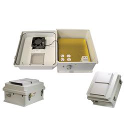 The NB141207-1HFA2 is a rugged weatherproof enclosure that is ideal for both indoor and outdoor applications. Constructed from molded halogen free self extinguishing fiberglass reinforced polyester (FRP), it is well suited for high temperature or corrosive environments. The integral mounting flange allows it to be wall mounted as well as on a flat surface without the need for extra mounting hardware. The fully gasketed lid features a stainless steel continuous hinge and stainless steel quick release latches with padlock hasps. The light grey color of the NB141207-1HFA2 is cleaner, cooler and aesthetically pleasing. Users can enjoy the physical benefits of better heat reflection and better UV resistance due to the lighter color. The contoured body provides an attractive and contemporary appearance. 120 VAC Mounting Plate with Lightning Protection The aluminum mounting plate features standard surge protected duplex 120 VAC outlets and a terminal block for easy hook up to the externally provided line power. In addition, the unit can accept up to two optional bulkhead-mount N-Type lightning protectors to protect the coaxial cable runs. Hot and Cold Environments To help ensure trouble-free operation of electronic equipment, proper operating temperatures inside an enclosure needs to be maintained. With the built-in Heater and Cooling system, internal temperatures can be better maintained. This model is ideal in Hot and Cold environments. The NB141207-1HFA2 includes a thermostat-controlled 200W heating system. The heater does not require the use of any of the AC outlets, leaving them all available for your equipment. No extra room for the heater is required since it is mounted underneath the plate. For cooling, the NB141207-1HFA2 includes a thermostat-controlled 16.4W fan. The high airflow, low noise fan used allows warm air to be actively pushed out the top vent while the lower vent passively pulls in outside air into the enclosure. Filters for both ports prevent foreign objects or debris from entering the enclosure. Like the heater, the cooling fan does not require the use of any of the AC outlets, leaving them all available for your equipment. User Adjustable Thermostat The 1HFA2 series features an adjustable thermostat that incorporates two separate thermostats, allowing the independent control of heating and cooling. The thermostat provides a temperature range of +14°F to +122°F for the heating and +68°F to +176°F for the cooling systems. With a switching difference of 12°F ±7°F tolerance. The heat thermostat features a Normally Closed (NC) circuit. When the temperature rises to the temperature set on the heat adjustment dial the circuit opens which turns off the heater. When the temperature falls below the temperature set on the heat adjustment dial the circuit closes which turns on the heater. The cooling thermostat features a Normally Open (NO) circuit. When the temperature rises to the temperature set on the cooling adjustment dial the circuit closes which turns on the cooling fan. When the temperature falls below the temperature set on the cooling adjustment dial the circuit opens which turns off the cooling fan.