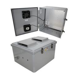 The box is a rugged weatherproof enclosure that is ideal for both indoor and outdoor applications. Constructed from High-Impact, UV Resistant Polycarbonate material that provides superior durability to impacts and ease of modification while maintaining minimum weight. It is well suited for high temperature or corrosive environments. The lid includes two vents with installed rain guards and filters. The included wall mount brackets come uninstalled and bagged with their hardware inside of the enclosure. Once the brackets are installed the enclosure can be mounted directly to any flat wall surface provided proper screws are used into secure studs. The brackets, once installed, also allow you to use our HGX-PMT pole mount kits. The lid features a non-metallic hinge system that allows for quick removal & can be reattached just as quickly without the need for any tools. The enclosure comes with a pair of stainless-steel latches with padlock eyes allowing you to secure the enclosure from tampering. The enclosure comes in a Dark Gray (Pantone 422C) Mounting Plate The aluminum mounting plate included with the NBPC181610-1HF features standard surge protected duplex 120 VAC outlets and a terminal block for easy hook up to externally provided line power. The enclosure also features holes for two N-Bulkhead lightning protectors or connectors, a grounding lug and cable conduit connector. Heating & Cooling To help ensure trouble-free operation of electronic equipment, proper operating temperatures inside an enclosure needs to be controlled. With the built-in heaters & dual cooling fans, internal temperatures can be better maintained. This model is ideal in hot and/or cold environments. For Heating the NBPC181610-1HF includes two thermostat-controlled 200W (400W total) heaters. Each 200W heater is controlled by its own thermostat. The heaters turn on when the internal temperature drops to 40° F (4° C) ±7° and turn off at 60° F (15° C) ±5°. The heaters do not require the use of any of the AC outlets, leaving them all available for your equipment. No extra room for the heaters is required since they are mounted underneath the plate. For Cooling the NBPC181610-1HF model includes two thermostat-controlled 16.4W (32.8W total) fans. The high airflow, low noise fans used allow warm air to be actively pushed out the top vent while the second fan on the lower vent actively pulls in outside air into the enclosure. Filters for both ports prevent foreign objects or debris from entering the enclosure. The fans turn on when the internal temperature rises to 120° F (49° C) ±5° and turn off at 90° F (32° C) ±10°. Like the heaters, the cooling fans do not require the use of any of the AC outlets, leaving them all available for your equipment. The HGX-PMT series of pole mounting kits allow the populated enclosure to be securely mounted to a variety of different size poles. Compatible versions include HGX-PMT13, HGX-PMT16, HGX-PMT28, HGX-PMT29, HGX-PMT30 & HGX-PMT33 附件